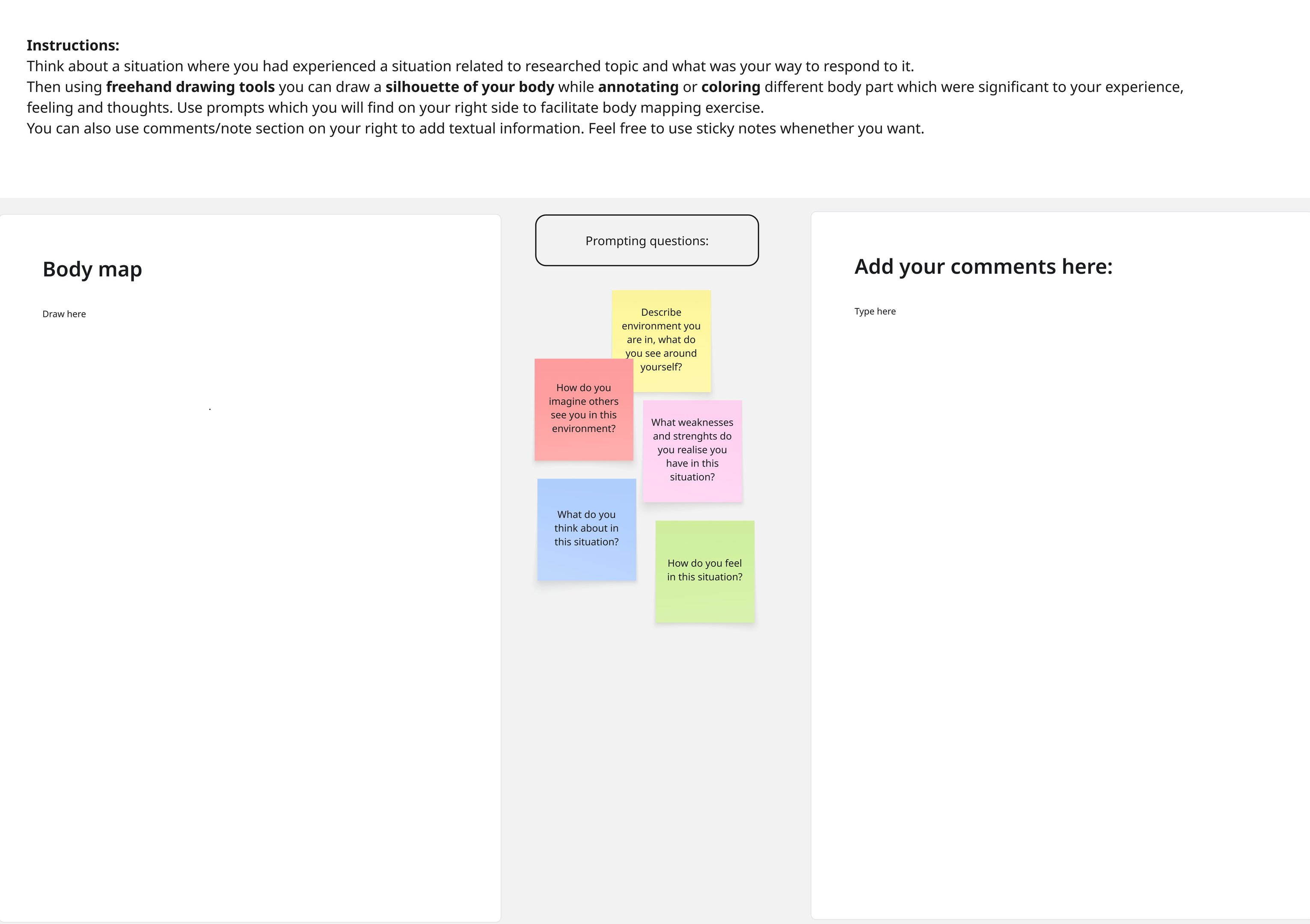 As these experiences are not easily articulated, you can use a body map exercise which might help answering the research question. You can find instructions for body mapping below, it is completely optional.